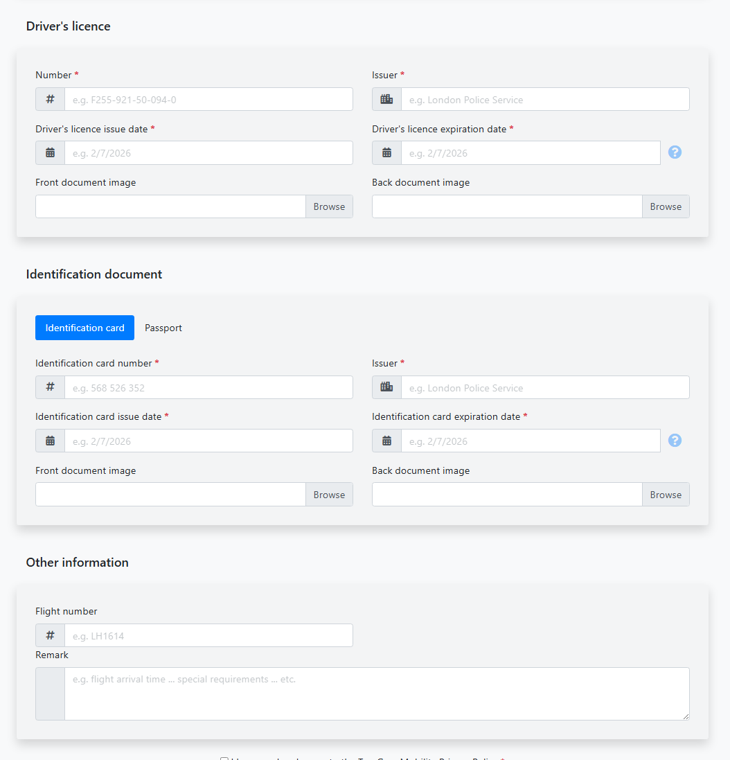 Here you can add optional extras (such as a child seat).